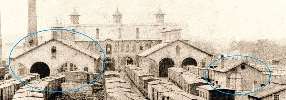 Looking south. Two buildings circled: left is standing and was the planing shop. Right circled no longer standing. Refer to Sanborn insurance maps for more detail. Erie RR or A&GW era?